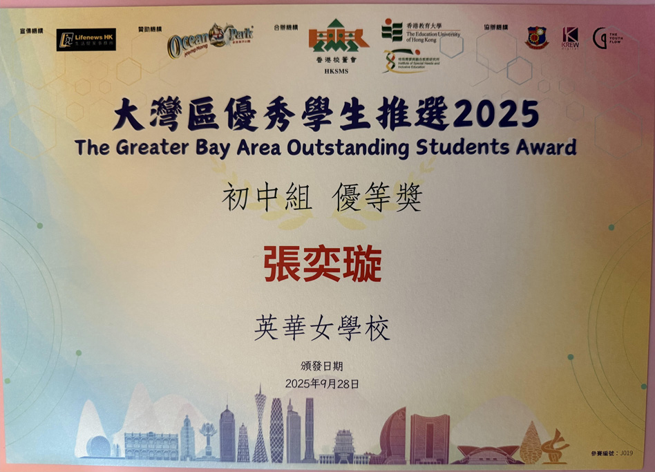 4E Cheung Yik Shuen and 6D Zhang Chi Yan have been awarded the Merit Award in the Junior Category and the Merit Award in the Secondary Category respectively at the Greater Bay Area Outstanding Students Award 2025.