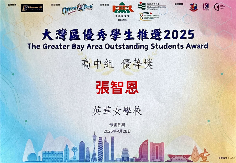The award was co-organised by the Hong Kong School Managers Society and the Education University of Hong Kong.   It recognizes students across the Greater Bay Area who excel academically and demonstrate well-rounded personal development.  The awardees not only have outstanding academic performance but also exhibit exceptional abilities in extracurricular activities and community service.