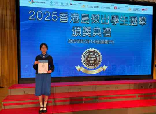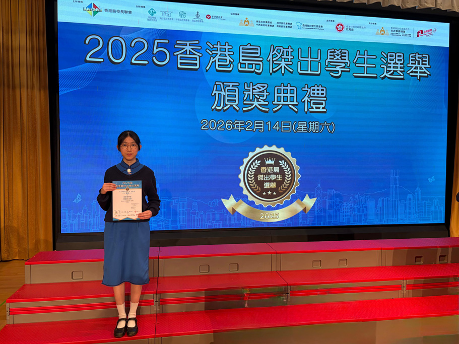 Wong Tsz (5A) and Ho Wing Yan (3B) were awarded the Hong Kong Island Outstanding Student Awards 2025 in the senior and junior sections respectively. Presented by the Hong Kong Island School Heads Association, the awards aim to recognize secondary school student leaders who have demonstrated excellent leadership skills and have served the school and society enthusiastically.