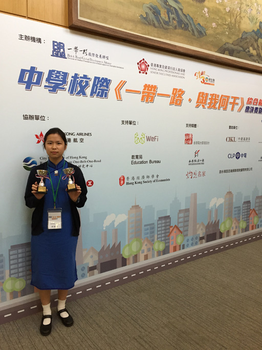 公民教育委員會與歷史科合作,提名學生參加《一帶一路‧與我何干》中學校際綜合能力比賽。活動由香港專業及資深行政人員協會、一帶一路國際發展聯盟及新界社團聯會合辦,目的是鼓勵中學生關心社會事務,了解「一帶一路」為不同地區帶來的機遇。是次活動有超過20間中學參與,參賽者於四月二十九日上午出席專題講座,下午以手機進行網上答題比賽。本校三位同學 (中五乙班陳嘉蔚、陳穎欣、劉德怡) 積極參與,表現出色,分別在通識範疇及何干範疇獲得答題傑出奬。