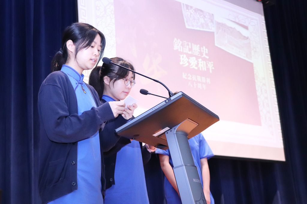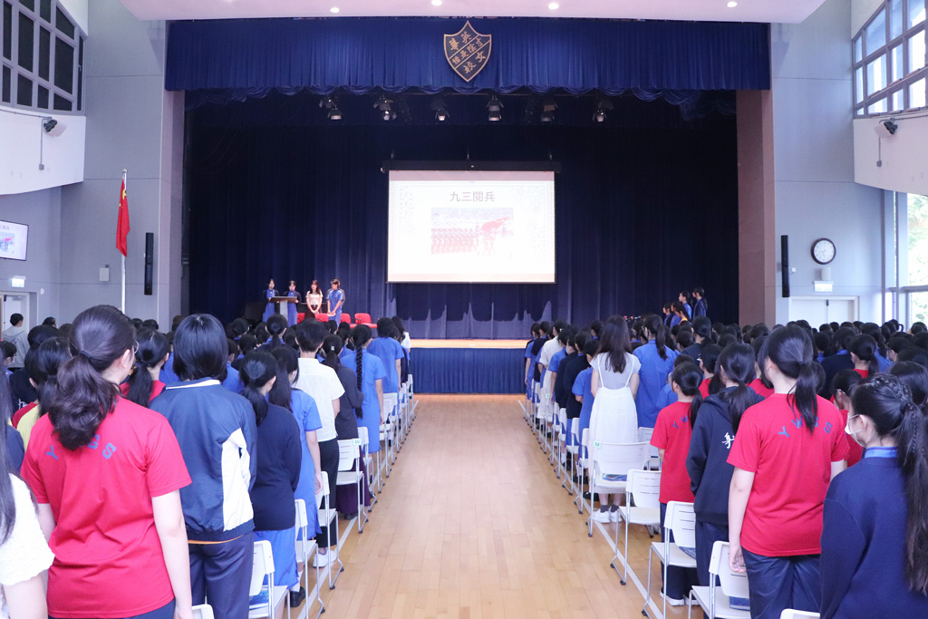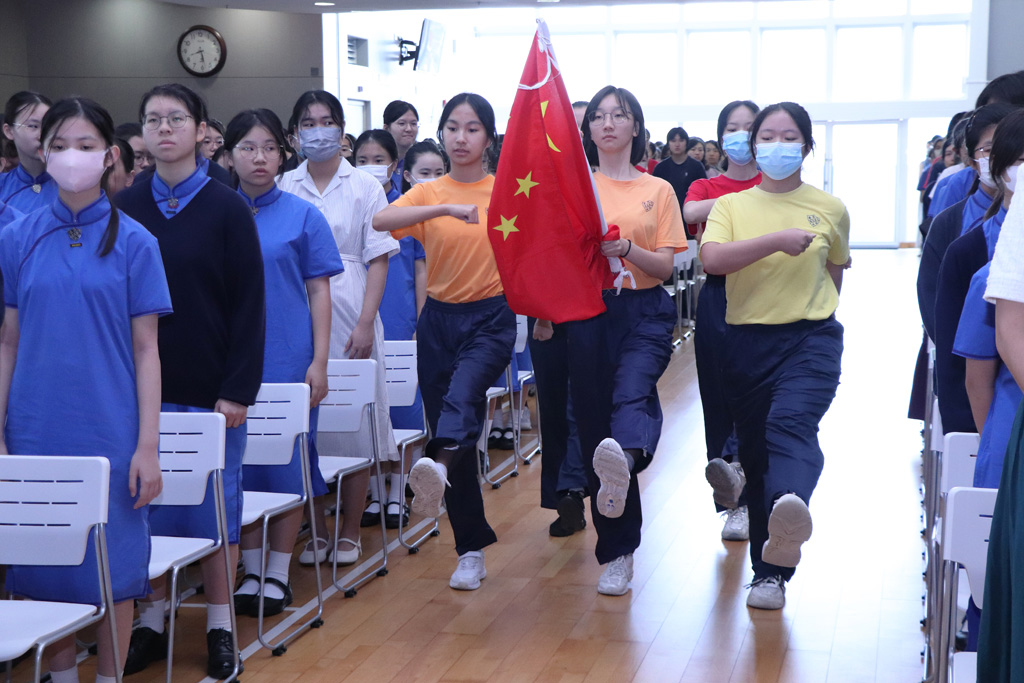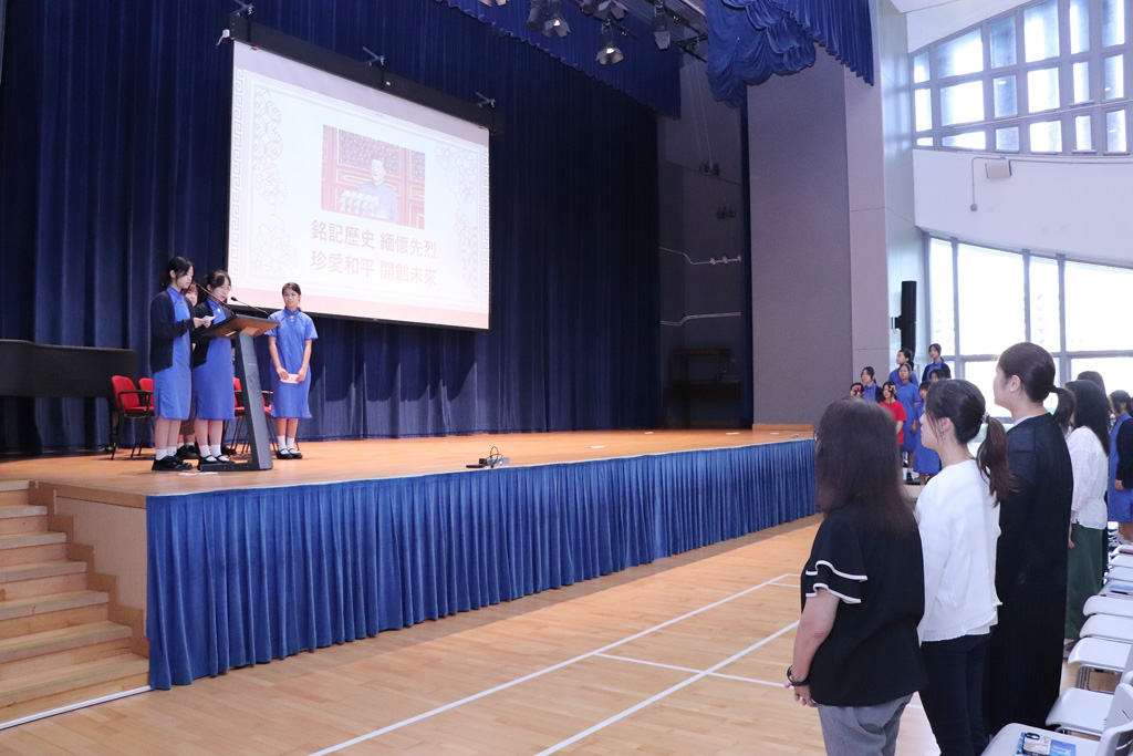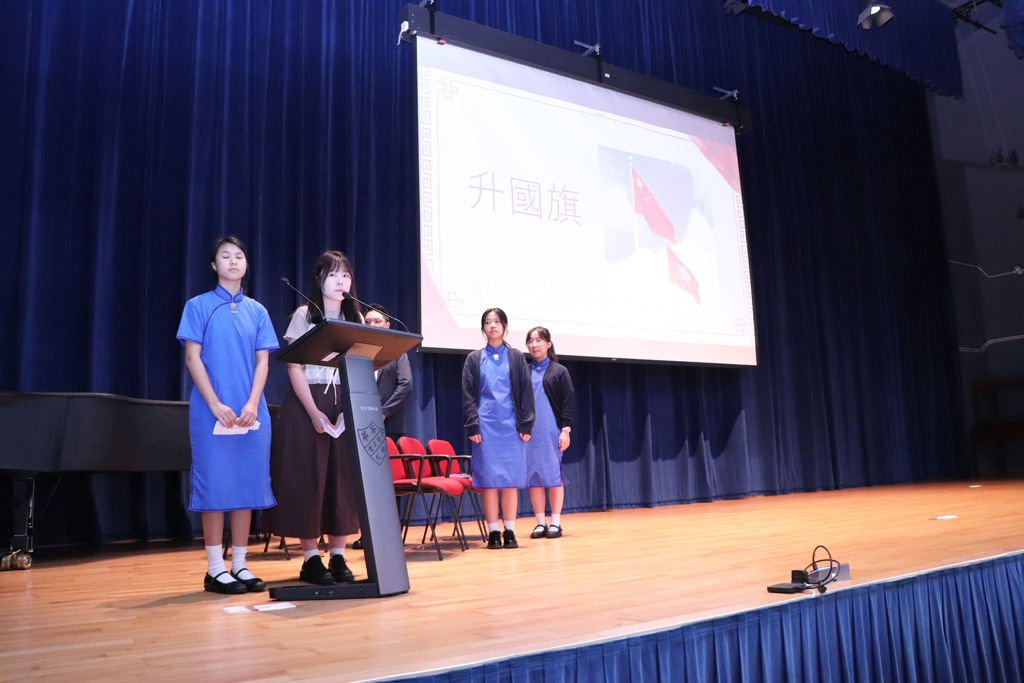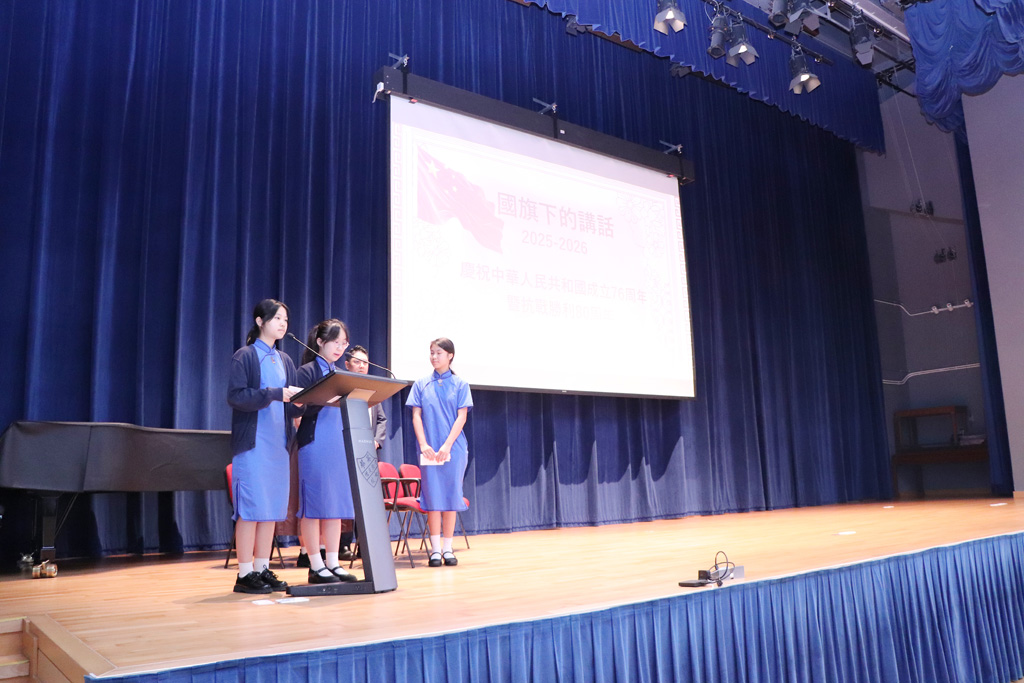 To honour the 76th Anniversary of the founding of the People’s Republic of China, as well as the 80th Anniversary of the Victory in the Chinese People’s War of Resistance against Japanese Aggression and the World Anti-Fascist War, our school held a flag raising ceremony led by our Flag Hoisting Team and the Civic Education Committee on September 30. Accompanied by an uplifting tune and the flawless march of the Flag Hoisting Team, the student body sang the national anthem with pride. The ceremony was followed by Cheung Yik Shuen (4C) and Gong Man Yuet (5A)’s heartfelt sharing on our country’s achievements in science and technology, the September 3rd Victory Day Parade, and the 80th Anniversary of our victory in World War II. It is an occasion for us to remember history, honour fallen heroes, cherish peace, and create a better future (銘記歷史 緬懷先烈 珍愛和平 開創未來). Through this ceremony, the values of national identity, unity, and peace were conveyed.