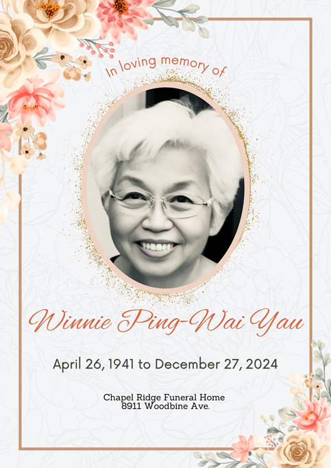 The family kindly declines floral tributes. In accordance with Sister Winnie’s wishes, all monetary gifts will be donated to Ying Wa Girls’ School (Hong Kong), the Toronto Christian Community Church, and the 105 Gibson Centre as an expression of gratitude. Following the service, the family will host a dinner reception at Dragon Legend at 5:00 pm and warmly invites friends and family to share mutual comfort and support.
