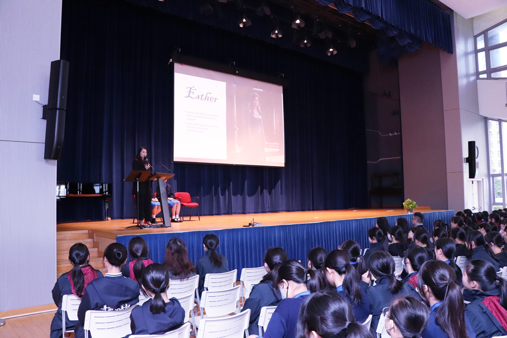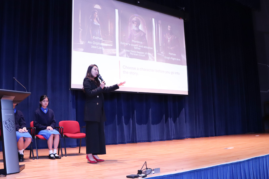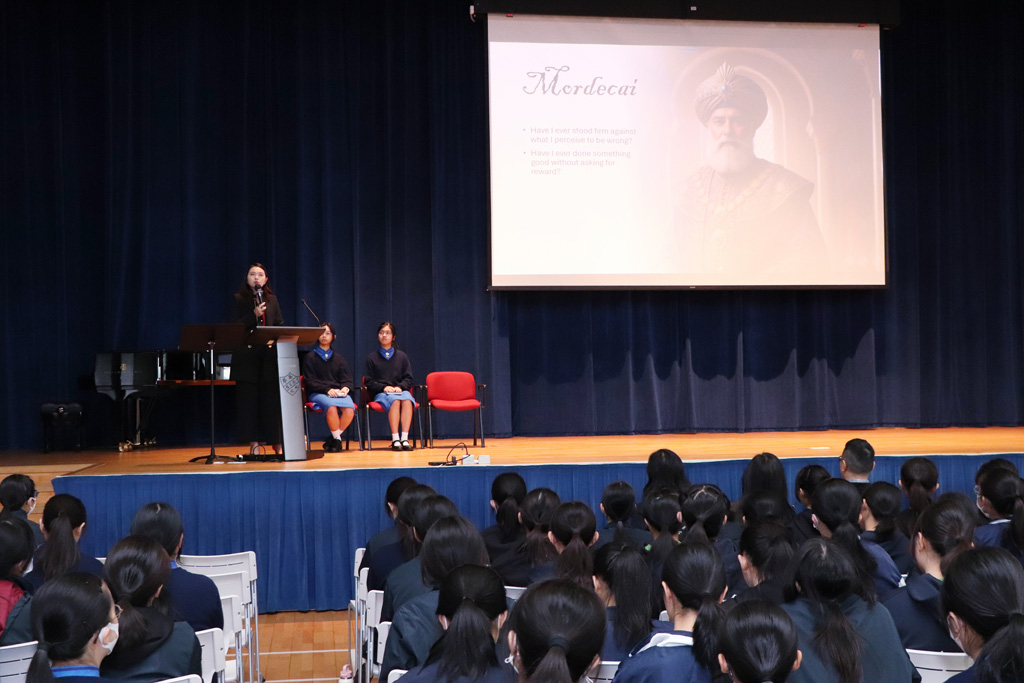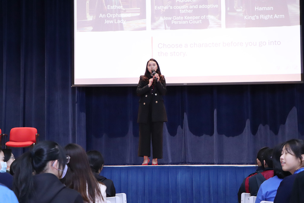 Our Principal, Ms Chuk, shared the Persian story of the Rise of a Queen, which was introduced to her by her parents during her childhood.  The three main characters are Esther (the orphaned Jewish lady), Mordecai (Esther’s adoptive father and gatekeeper of the Persian Court), and Haman (the King’s right hand).  The story revolves around how Esther saved her people, the Jews, from the vengeful and cruel Haman.  Ms Chuk encouraged us all to reflect on these characters.  Did Haman’s hatred ultimately turn against him?  Can we resemble Mordecai by standing firm and doing good without seeking a reward?  Can we learn from Esther to fulfill our roles constructively and positively influence others?  Ms Chuk urged students to refer to the Book of Esther to gain a deeper understanding of God’s guidance and plan.